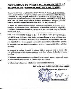 C’est la délivrance de la réquisition sollicitée qui aboutit à l’interpellation de la mise en cause dans la matinée du mardi 28 octobre 2025 au quartier Hamdallaye- Mosquée. Elle a été conduite ensuite à l’unité de Gendarmerie pour enquêtes. En attendant le déferrement de la procédure à son Parquet, le procureur de la République appelle à l’esprit de responsabilité et de maturité de l’ensemble de la population.