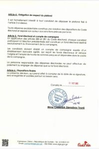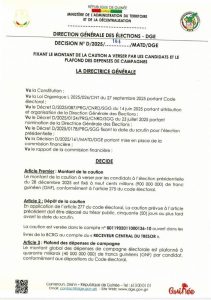 Dans ladite décision, il est indiqué que la caution doit être déposée au trésor public, cinquante jours au plus tard avant la date du scrutin conformément aux dispositions de l’article 277 du code électoral. L’article 3 de la décision informe que le montant global des dépenses de campagne électorale est plafonné à 40 milliards de francs guinéens par candidat, conformément aux dispositions du Code électoral.