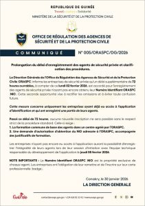 L’Office de Régulation des Agences de Sécurité et de la Protection Civile (ORASPC) a annoncé une prolongation exceptionnelle de 72 heures ouvrables, à compter du lundi 02 février 2026, pour l’enregistrement des agents de sécurité privée ne disposant pas encore de leur Numéro Identifiant ORASPC (NIO).